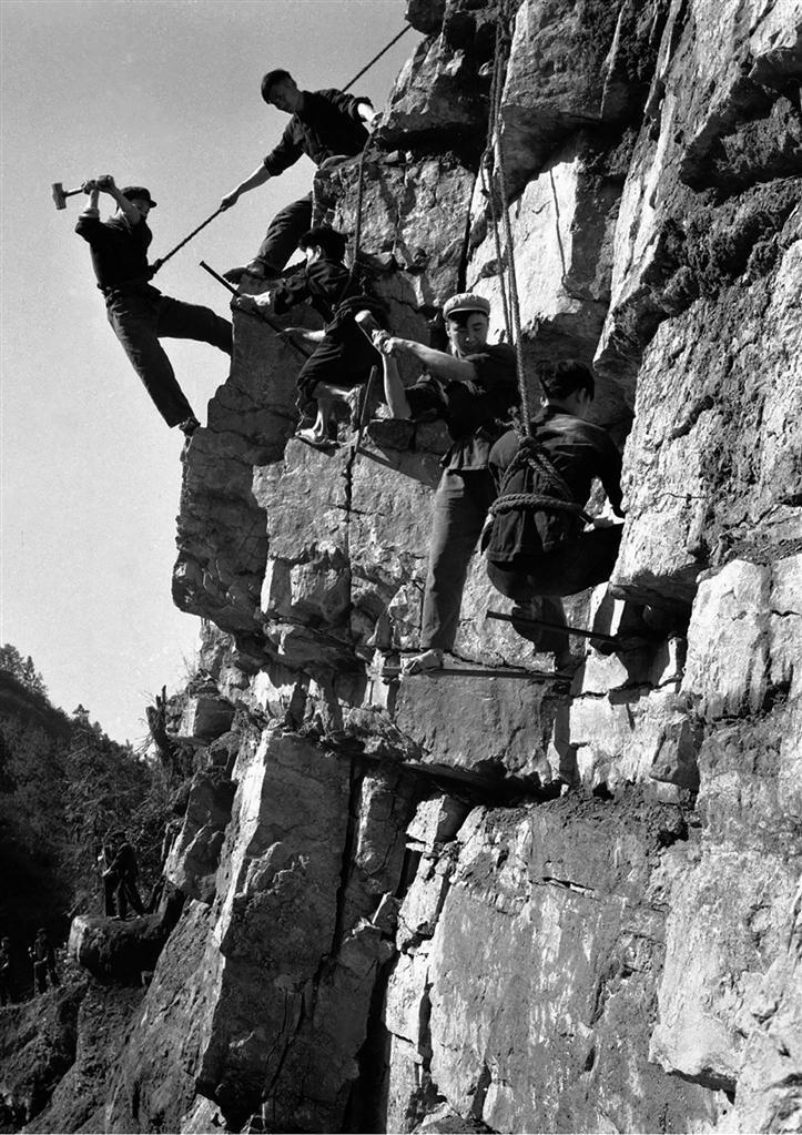 20世纪70年代,龙山县洛塔公社,村民在海拔1800多米的悬崖上,修筑接通县城的公路,从而结束了肩挑背负的历史。 唐克立 摄