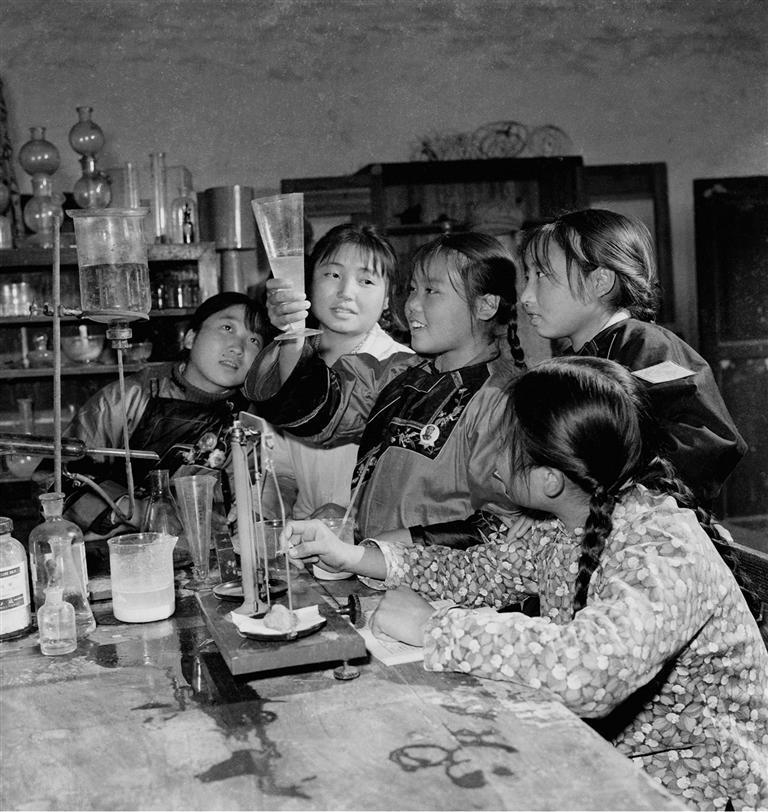 1973年,一条酉水河联系着湖南省花垣县茶峒公社、四川省秀山县洪安公社、贵州省松桃县乜架公社三地人民,茶峒民族师范学校的三省边区学生在试验室里。 唐克立 摄