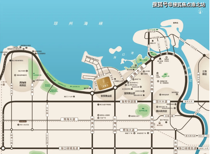 比邻滨海大道,西至西海岸,东至丘海大道、龙昆北路,距离:海秀快速路(约3km)、海口东站(约6.5km)、海口火车站(约13.4km)、美兰国际机场(约19km)。