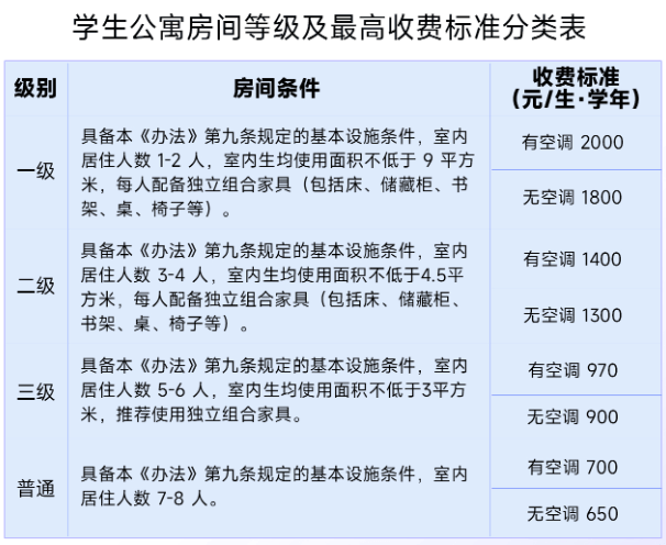 室内住超8人或设施不达标:有空调最高550元/生/年,无空调最高500元/生/年。